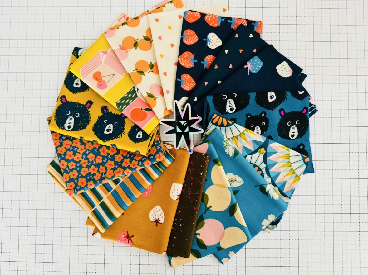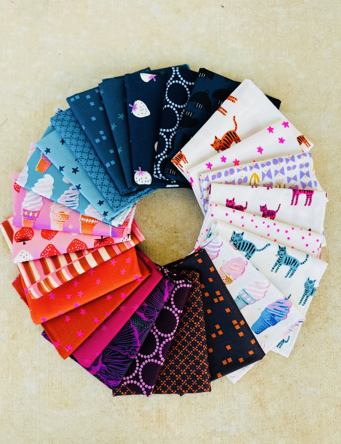 15 curated fat quarters in hip Ruby Star Society fabric — strawberries, ice cream cones and pastel blended tones.