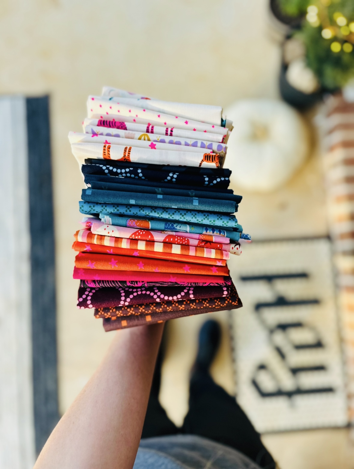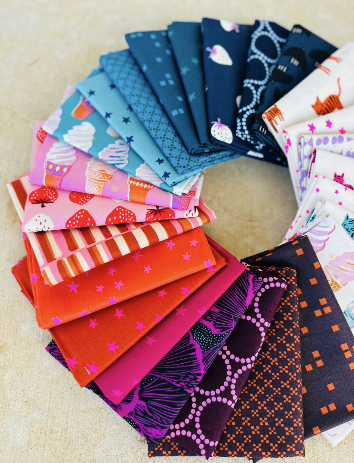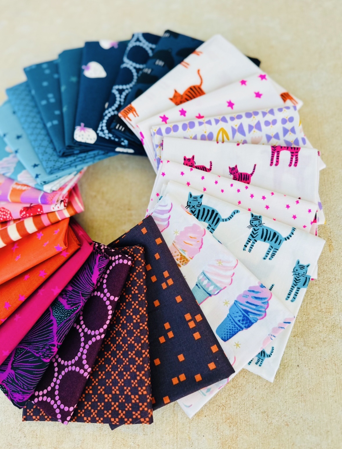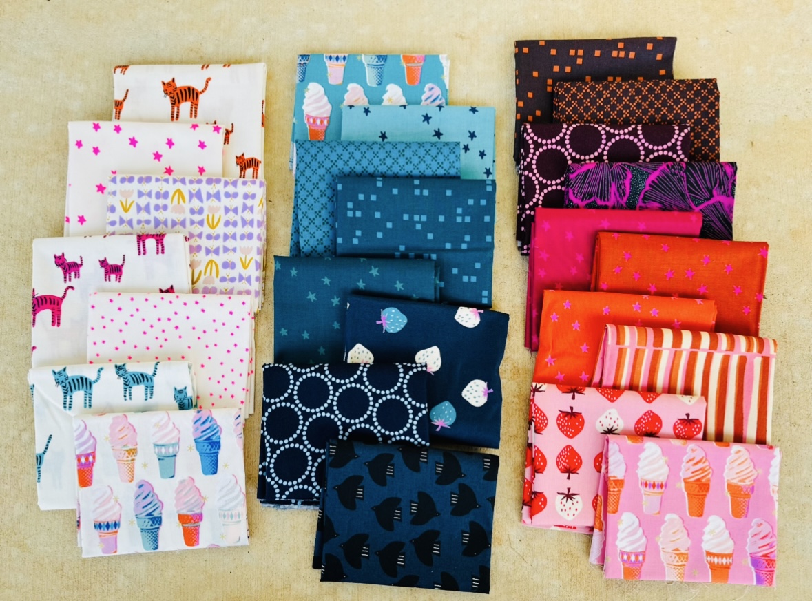 25 curated fat quarters in hip Ruby Star Society and Lizzy House fabric — tigers, stars, ice creams, strawberries and lovely jewel-toned blended warmth.