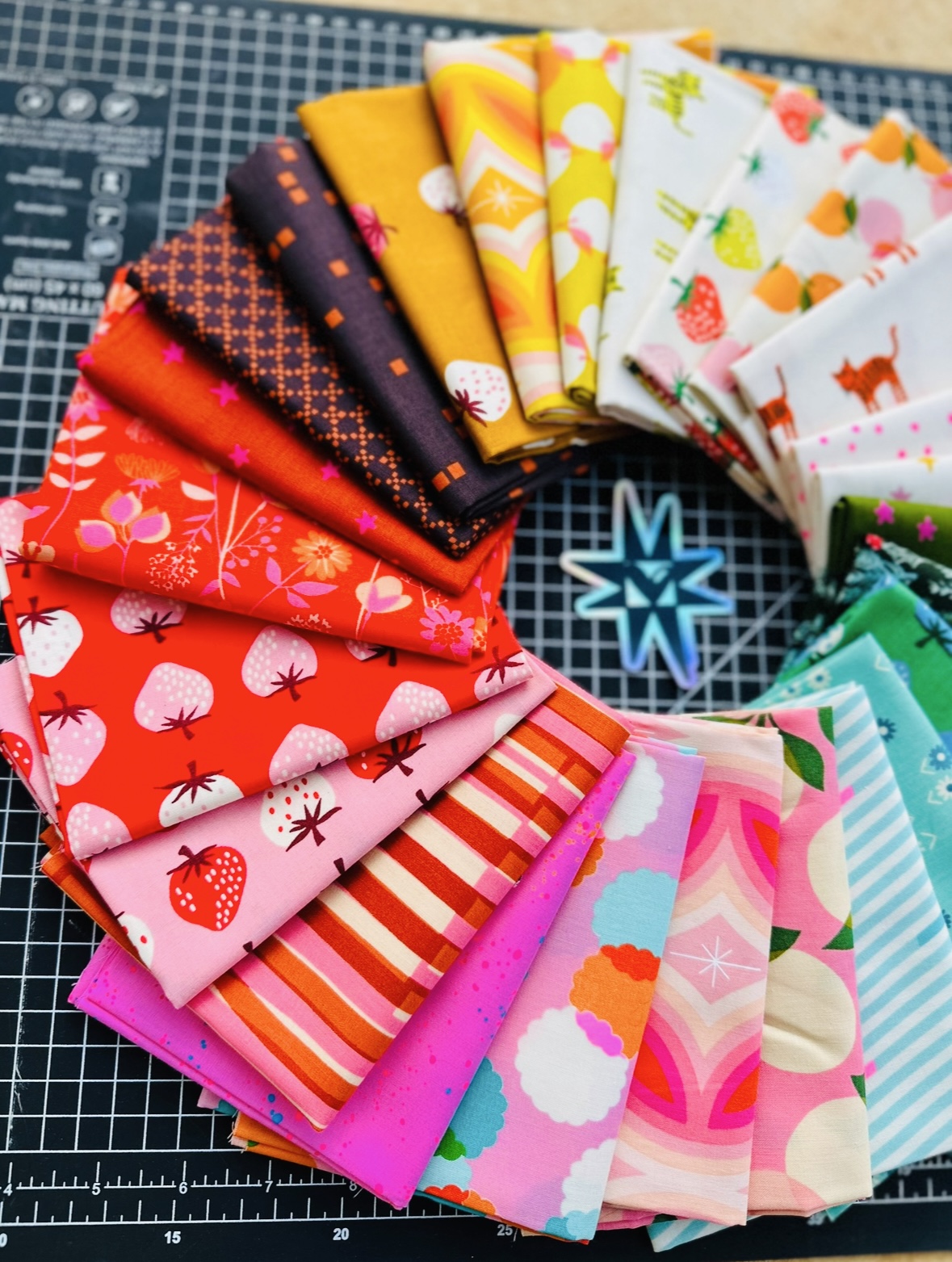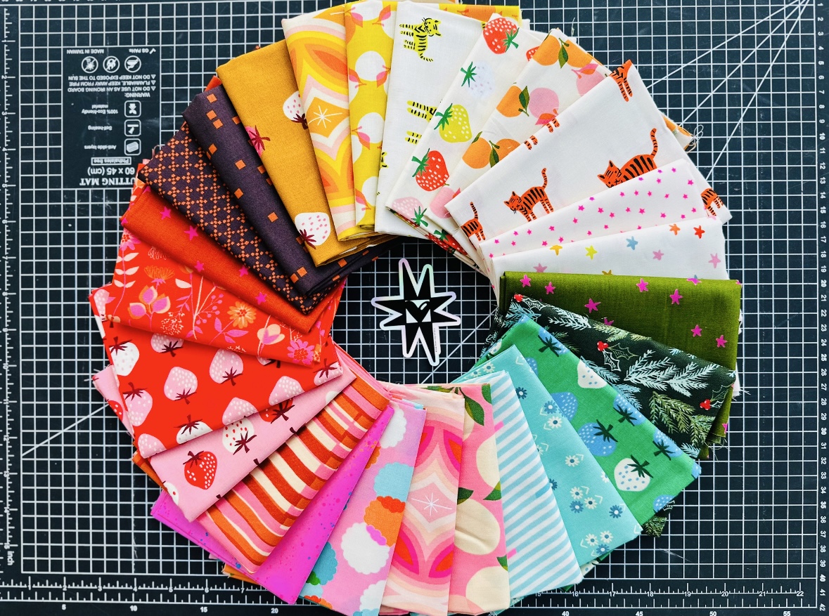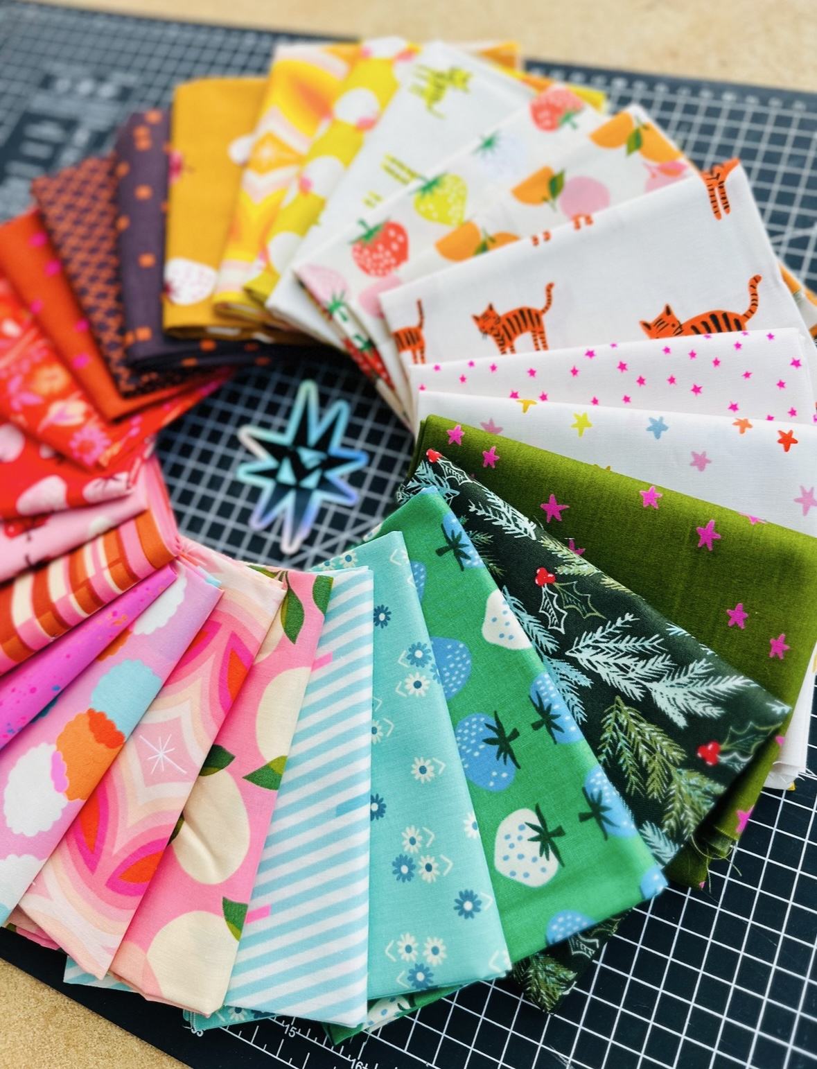 25 curated fat quarters in hip Ruby Star Society and Moda fabric with a little touch of Christmas — stars, pine branches, stripes, tigers, strawberries and vibrant jewel-toned blended warmth. The stripes remind me of ribbons, the vintage prints of ornaments — all on a cozy green Christmas tree.